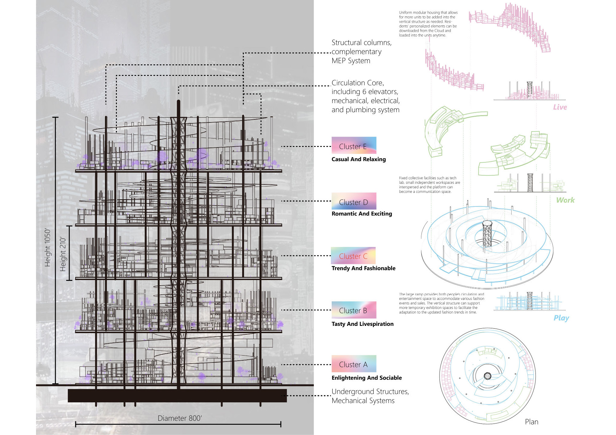 In the future, visual and auditory experiences will compress and translate into the Metaverse, but other subtle sensory experiences like touch, smell, and taste will be difficult to simulate fully. Architectural spaces will integrate the dynamic and changeable spatial functions of Live, Work, and Play to accommodate new lifestyles. Three-dimensional multimedia interactive layers will be fused into the space, providing infinitely updated information. As a result, the building would no longer be a silent solid. Instead, the physical space, supported by technology, will also strengthen the connection between people in the surrounding community.
